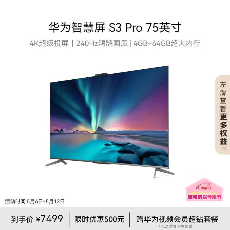 华为智慧屏 S3 Pro 75英寸 Pura 70投屏好搭档 超高清屏 智能液晶游戏超薄护眼大屏电视机HD75AJMS价格:7499.00元!