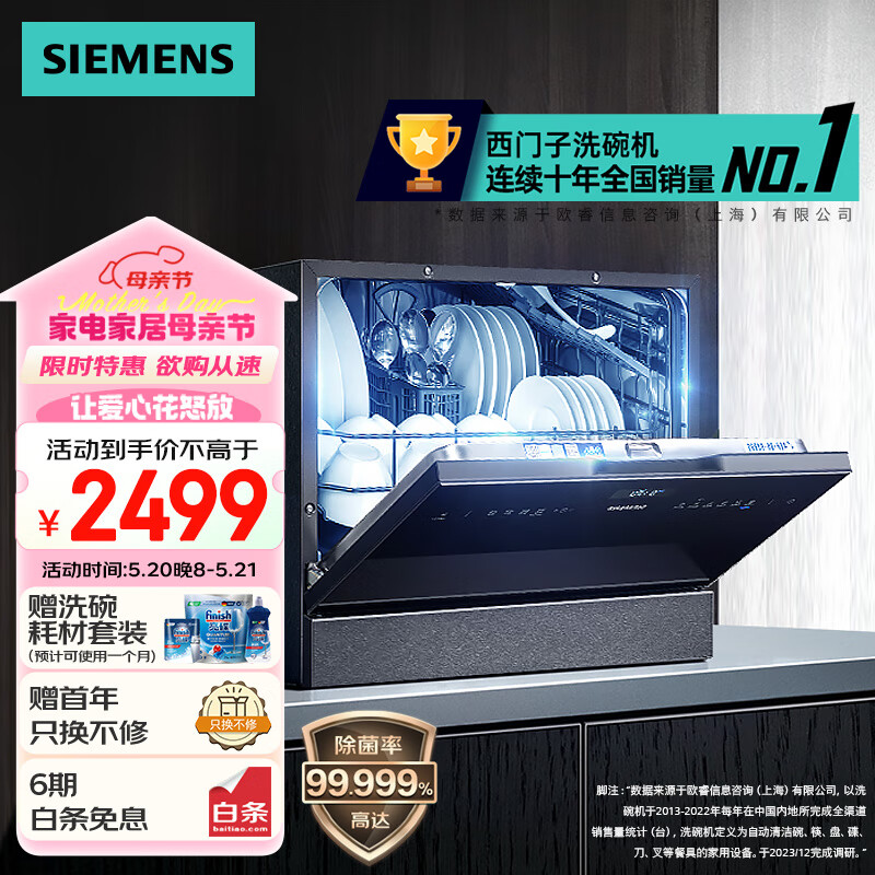 西门子5套嵌入式台式洗碗机 家用 易安装 高温除菌 加强烘干 原装进口 黑色 SK256B88BC价格:3499.00元!