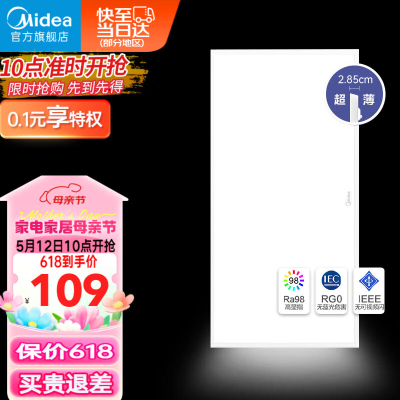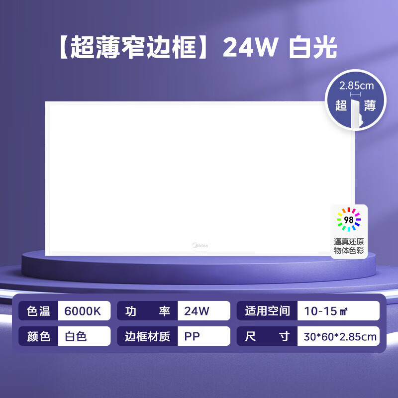 美的(Midea)LED厨房灯厨卫灯嵌入式面板灯集成吊顶护眼高显指窄边框24瓦价格:109.00元!
