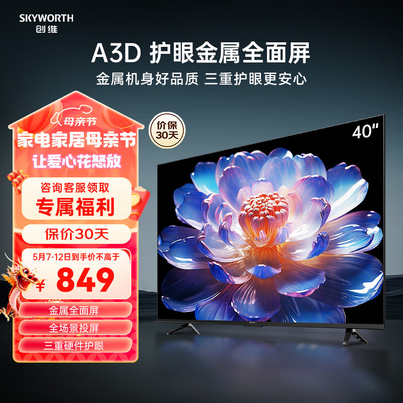 创维电视40A3D 40英寸高清 护眼金属屏智能投屏电视机 1+8G内存 三重硬件护眼40M3D 40英寸价格:849.00元!