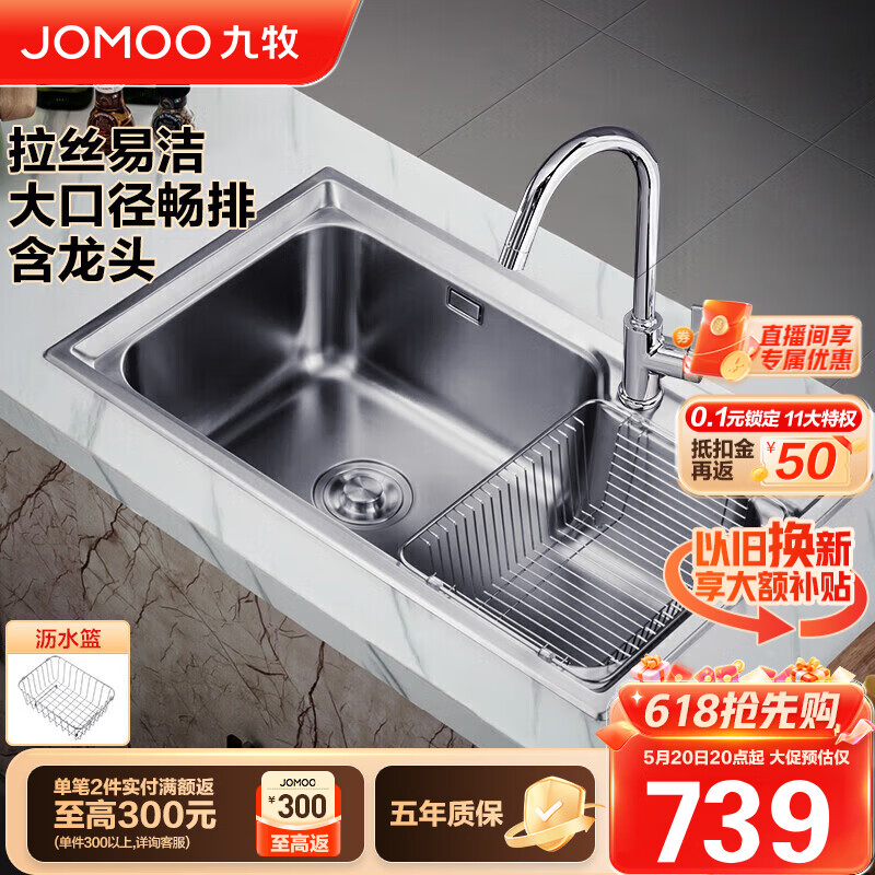九牧(JOMOO)不锈钢水槽不沾油大容量洗菜盆洗碗池大单槽龙头套餐75*45 02228价格:909.00元!