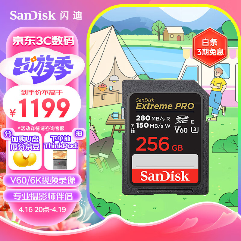 闪迪(SanDisk)256GB V60 SD存储卡U3 C10 6K高速相机内存卡 读速280MB/s 写速150MB/s 高清拍摄 畅快连拍价格:1199.00元!