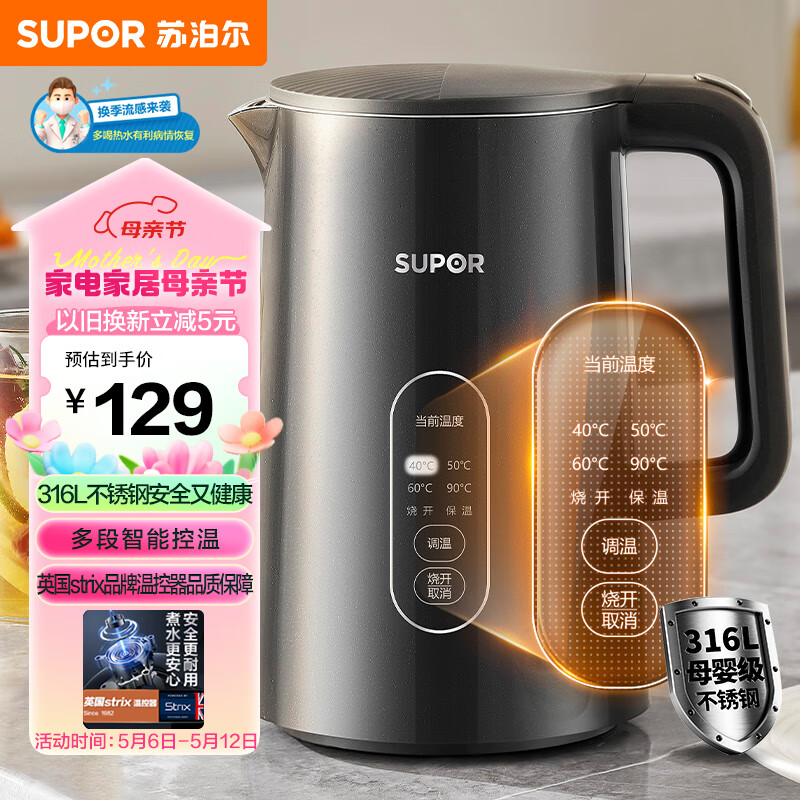 苏泊尔(SUPOR)1.5L侧显温度烧水壶 316L不锈钢 触控操作 5段调温保温恒温电热水壶电水壶 养生 SW-15J72L价格:129.00元!