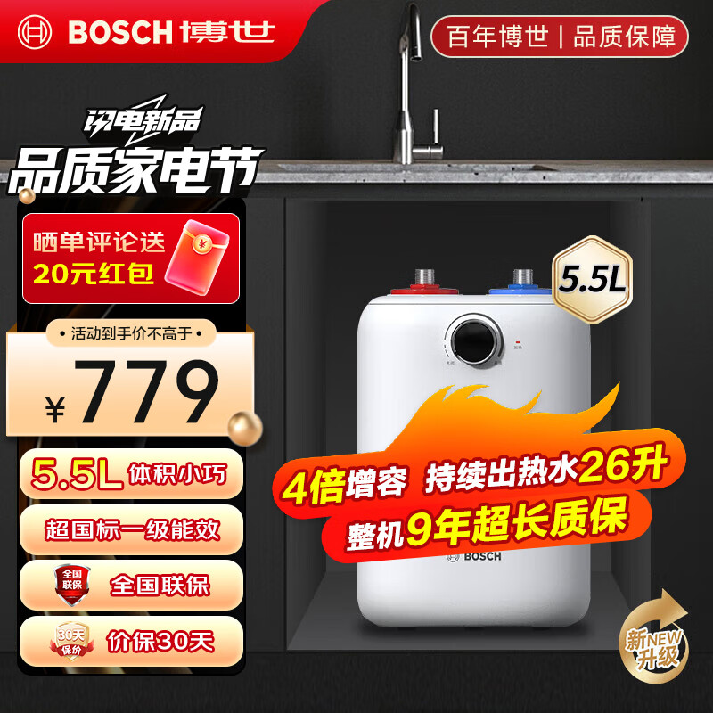 博世(BOSCH) 一级能效小厨宝 5.5升迷你电热水器 速热恒温 小尺寸 德国 多重防护 TR 3100 T 5.5-2 MH价格:779.00元!