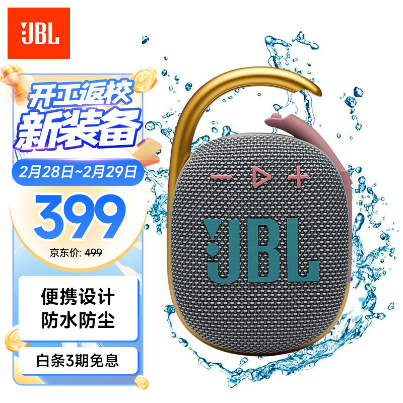 JBL CLIP4 无线音乐盒四代 蓝牙便携音箱 低音炮 户外迷你音箱 防尘防水 超长续航 一体式卡扣 灰色价格:399.00元!
