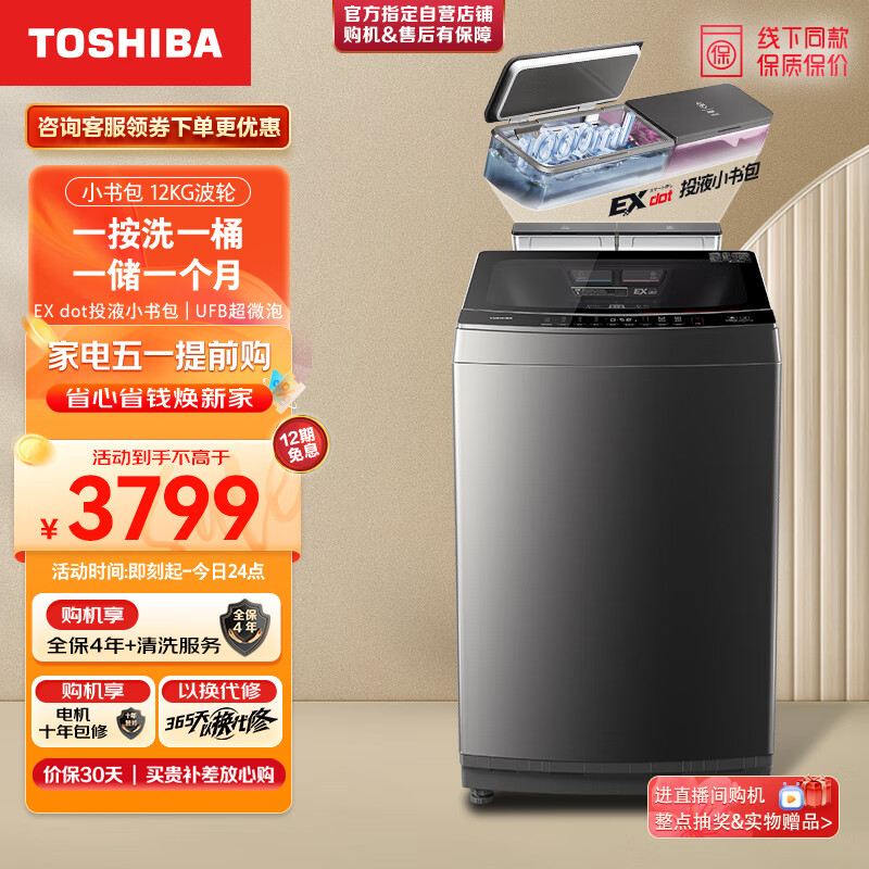 东芝(TOSHIBA)波轮洗衣机全自动 T16投液小书包 12公斤大容量 UFB超微泡 不弯腰设计 变频电机 DB-12T16DT价格:3799.00元!