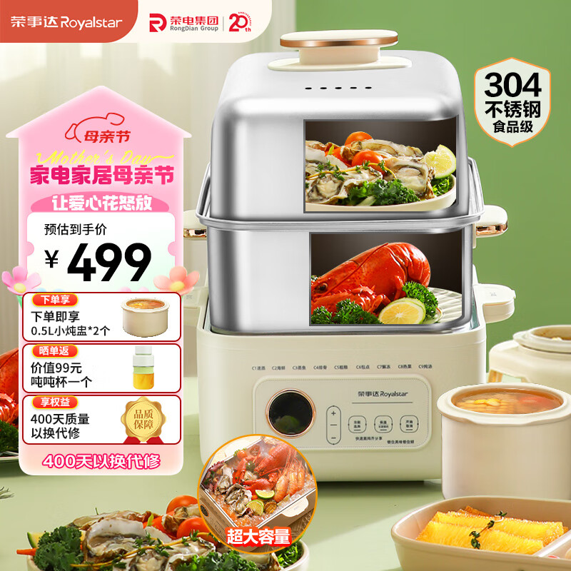 荣事达(Royalstar)电蒸锅 家用多功能电蒸笼蒸炖锅 隔水炖盅全自动预约定时 蒸汽烹饪 不锈钢蒸汽蒸锅RS-ZG150A价格:499.00元!
