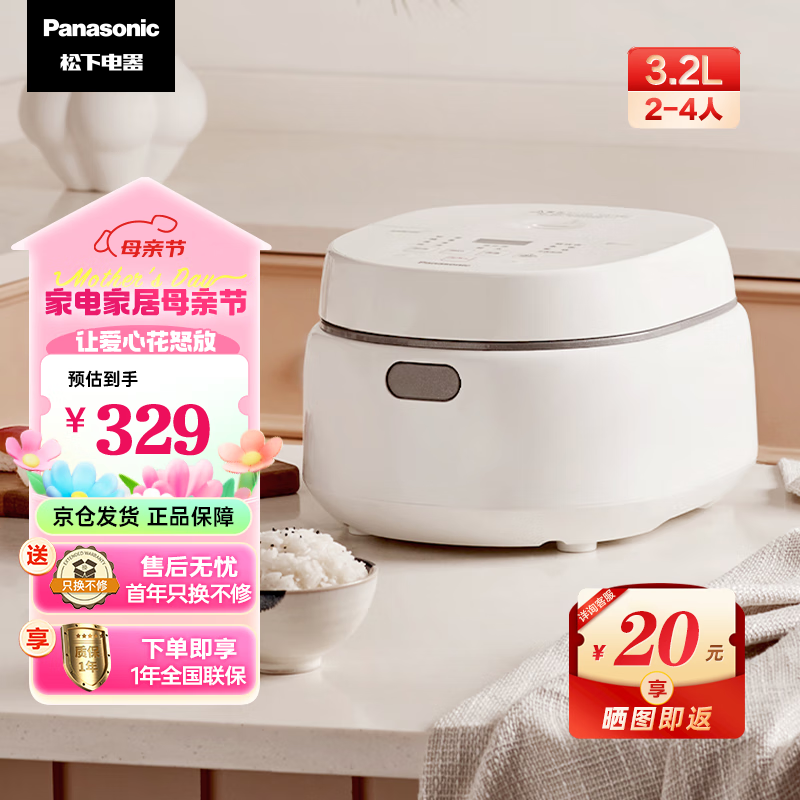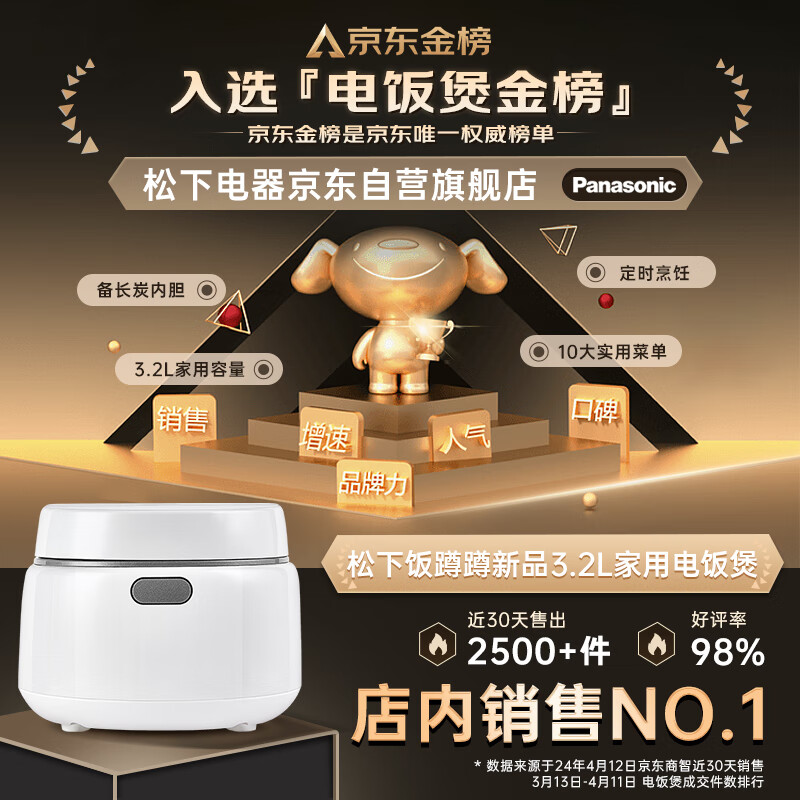 松下(Panasonic)饭蹲蹲电饭煲3.2L家用2-6人智能电饭锅 备长炭内胆涂层 快速煮饭可预约 SR-DL101价格:298.00元!