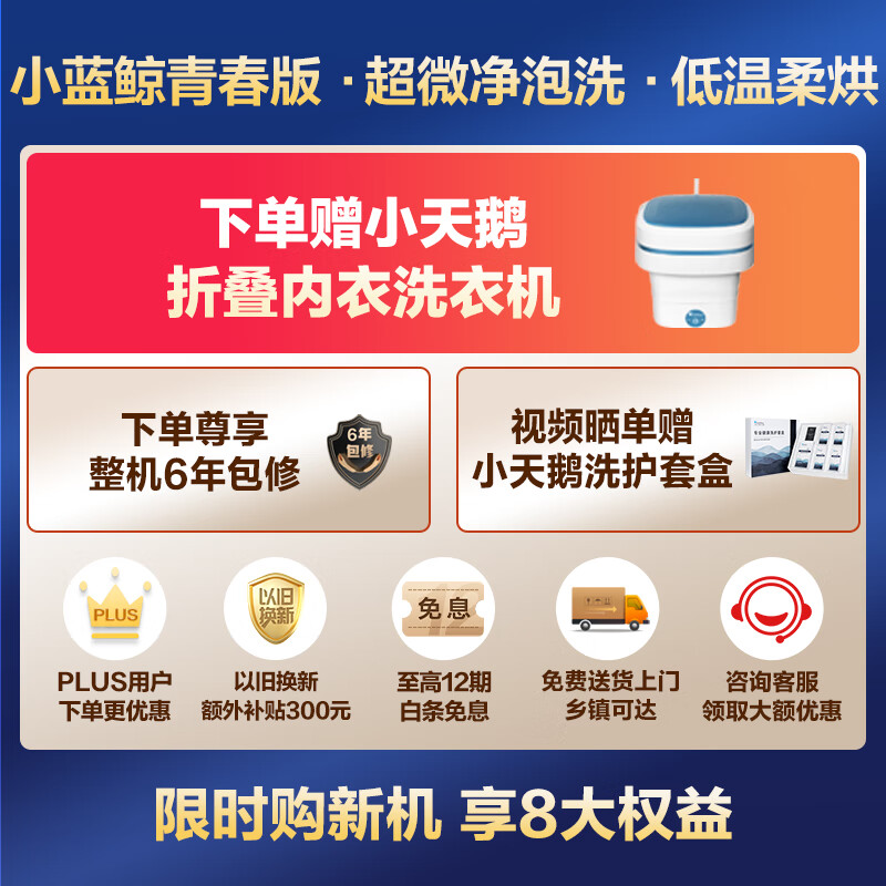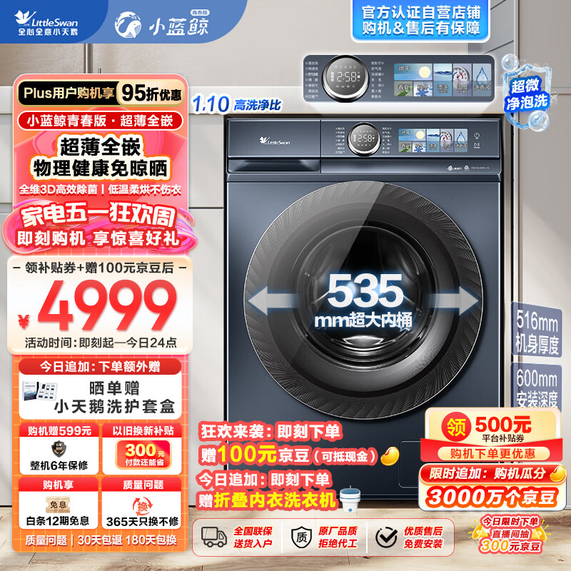 小天鹅(LittleSwan)滚筒洗衣机全自动【小蓝鲸青春版TD100V86PLUS】洗烘一体机 超薄全嵌 超微净泡洗 水魔方 10公斤价格:5099.00元!