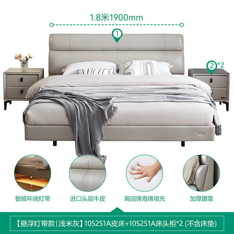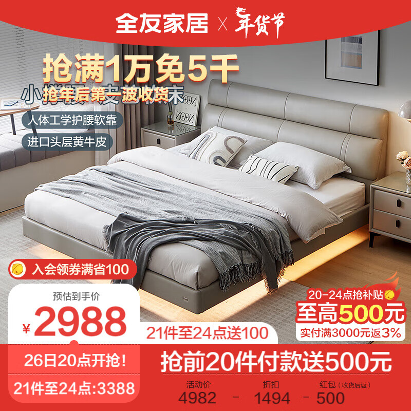 全友家居 真皮床简约悬浮皮艺床双人床1.8米卧室感应灯带家具105251A价格:4982.86元!