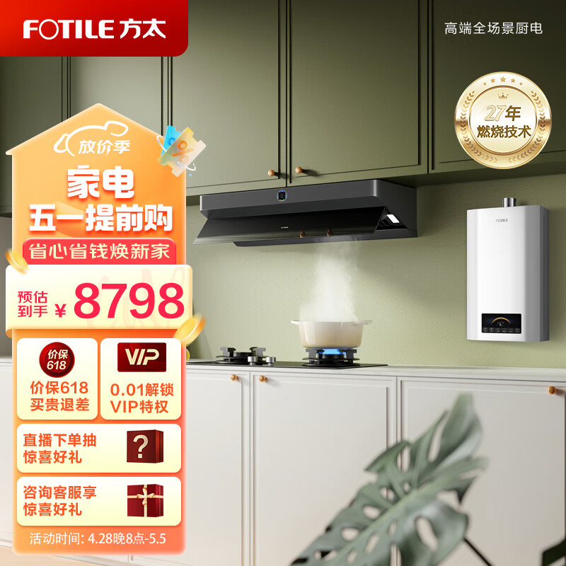 方太(FOTILE)家用厨房烟灶热三件套 24风量顶侧一体变频烟机 5kW联动燃气灶 16升热水器F2.I+THF1-G+S16D1价格:8798.00元!
