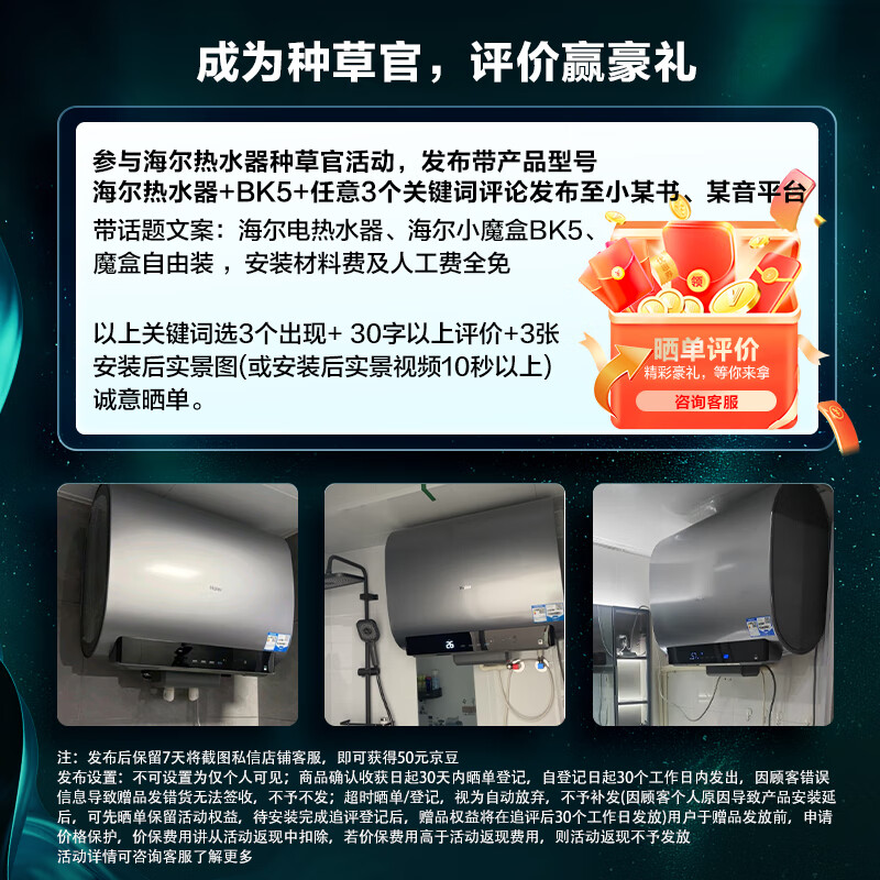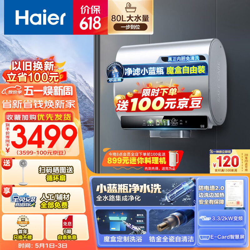 海尔(Haier)80升【小魔盒】小蓝瓶美肤净水洗定制洗浴超薄扁桶双胆家用电热水器3300W变频速热EC8003HD-BK5AU1价格:3899.00元!