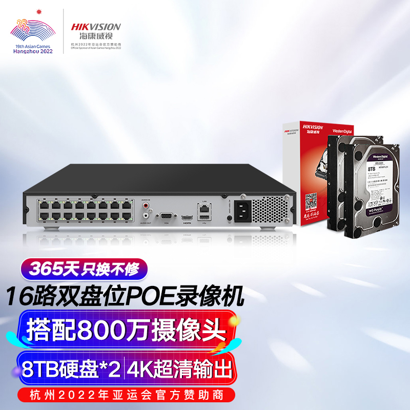 海康威视网络硬盘录像机监控16路POE网线供电满配16个摄像头带8T硬盘DS-7816N-R2/16P价格:5350.00元!