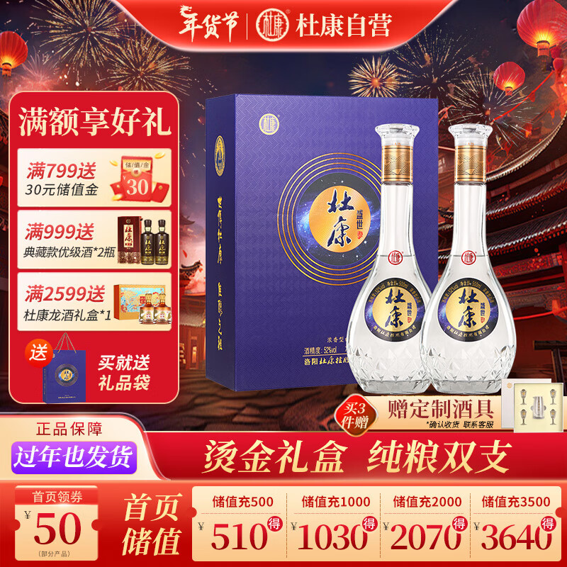 杜康盛世浓香型高度白酒52度500ml*2瓶双支礼盒【年货送礼河南特产】价格:189.00元!