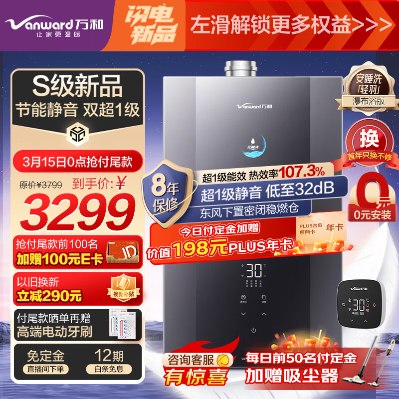 万和燃气热水器16升超一级静音 TSI增压瀑布浴 超一级能效 AI双伺服恒温 安睡洗2.0系列 F9D MAX价格:3799.00元!
