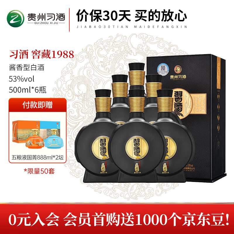 习酒贵州习酒 酱香型白酒 纯粮固态发酵 过年送礼 53度 500mL 6瓶 窖藏1988 原箱价格:4108.00元!