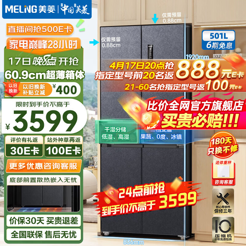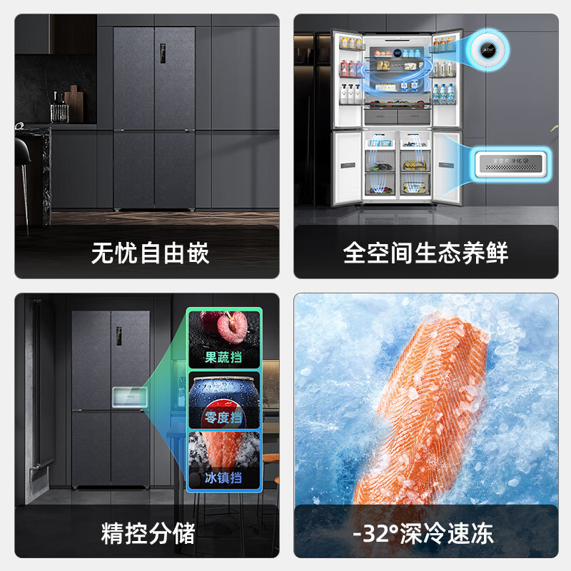 美菱(MeiLing)501升十字四门冰箱双开门超薄嵌入白色一级能效双变频风冷无霜底部散热对开门电冰箱【无忧嵌】 BCD-501WPU9CX-砂岩灰价格:3999.00元!