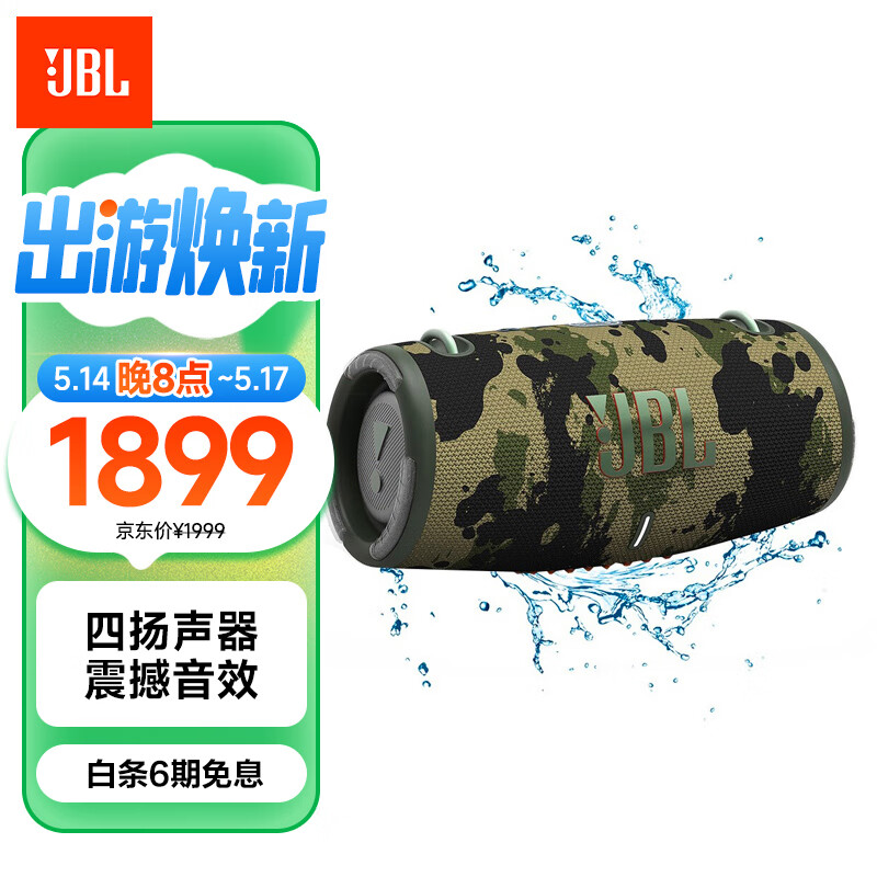 JBL XTREME3 音乐战鼓三代 便携蓝牙音箱 户外音箱 电脑音响 低音炮 四扬声器系统 防尘防水 迷彩色价格:1899.00元!