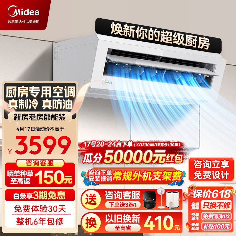 美的(Midea)厨清凉 厨房空调 专用吸顶式 小1.5匹变频 防油烟 大冷量 易安装CKF-30XW/BN8Y-XD300【极地白】价格:3599.00元!