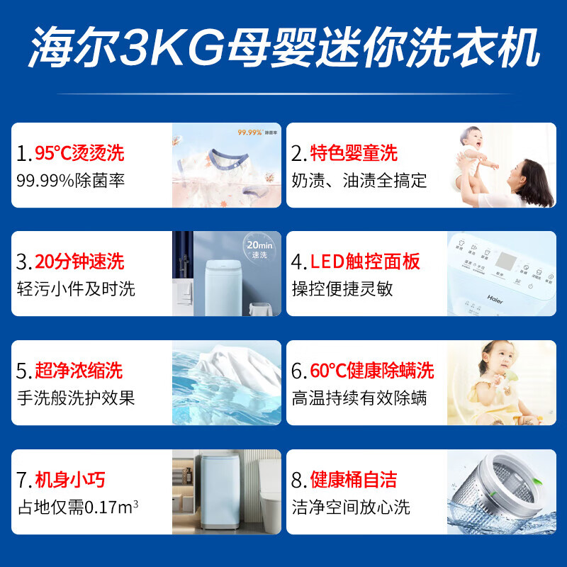 海尔(Haier)波轮洗衣机全自动3KG迷你洗衣机婴儿儿童宝宝分区洗护内衣洗95度高温除菌螨XQBM30-R376[家电]价格:1299.00元!