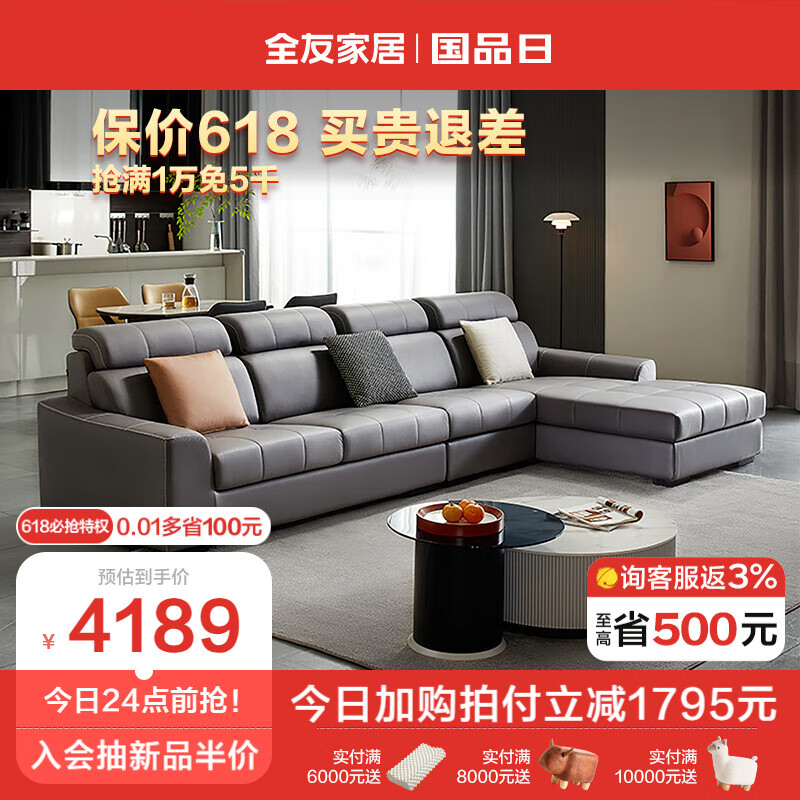 全友家居 贵妃科技布艺沙发现代简约大户型客厅转角L型沙发家具102251价格:5984.29元!