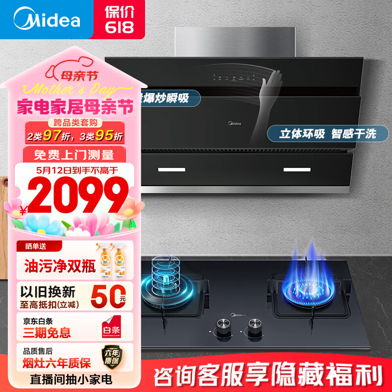 美的(Midea)抽油烟机燃气灶套装小户型厨房烟灶套装 21大吸力自动清洗油烟机灶具套装J25S+Q36S防干烧灶价格:2099.00元!