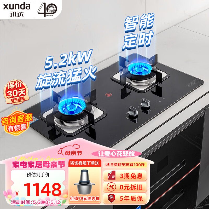迅达(XUNDA)燃气灶天然气灶家用 双灶具灶台 嵌入式台式两用 5.2KW旋流猛火灶 定时可拆卸炉头 F3-天然气价格:1248.00元!