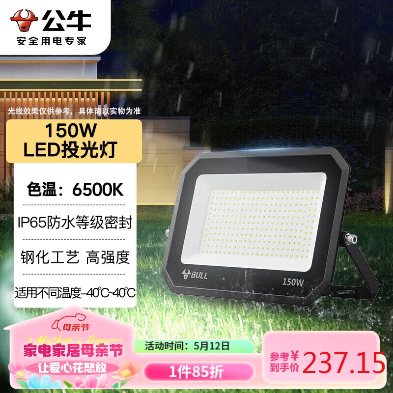 公牛(BULL)LED投光灯户外庭院工厂园林灯露营灯 IP65防水等级150W-6500K白光价格:279.00元!