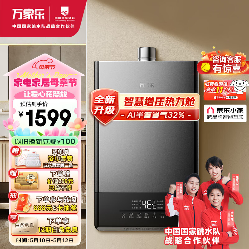 万家乐13升零冷水燃气热水器水气双伺服恒温APP智控智慧热力舱降噪天然气增压JSQ26-13DL1S京东小家价格:1599.00元!