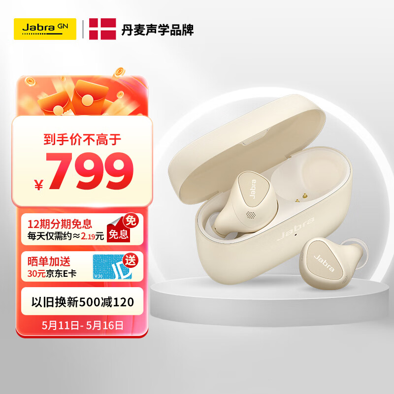 捷波朗(Jabra)ELite5主动降噪耳机E5真无线蓝牙耳机11级声噪控制6麦克风降噪小水滴 IP55 支持单耳 米金色价格:799.00元!