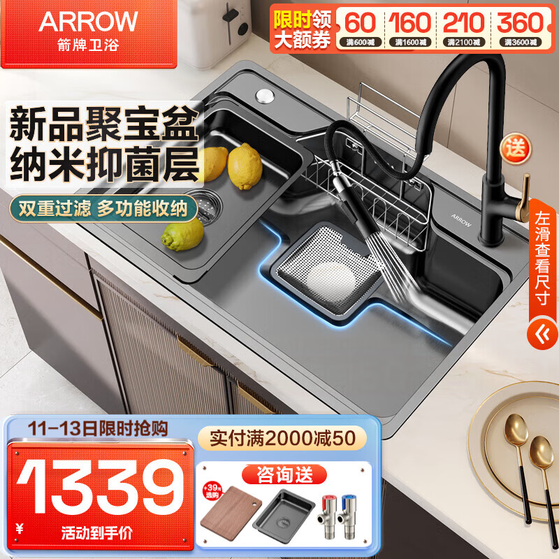 箭牌(ARROW)304不锈钢日式水槽大单槽洗菜盆纳米台上台中台下洗碗池 70*48聚宝盆+冷热黑金抽拉龙头价格:1589.00元!