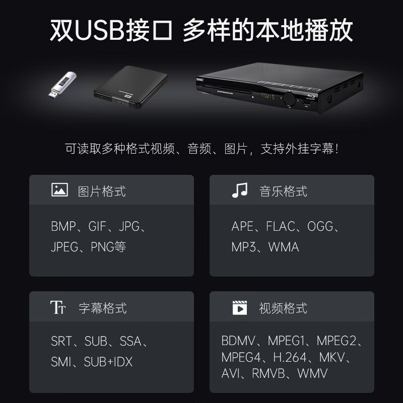 播放格式:CD,DVD,VCD,MPEG4,MP3,SVCD,RMVB,CD-R