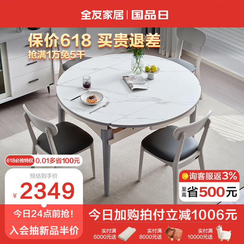 全友家居 餐桌现代简约岩板餐桌椅可圆可方折叠款餐厅吃饭桌子DW1028K价格:3355.71元!