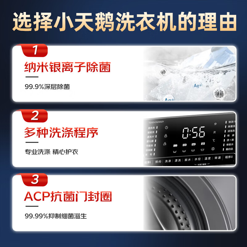 小天鹅(LittleSwan)滚筒洗衣机全自动 10公斤大容量 银离子除菌 一级能效 家用变频 WIFI智控 TG100VC62WADY价格:1768.00元!
