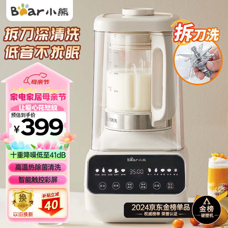 小熊(Bear)低音降噪破壁机 1.5L家用可拆洗豆浆机 多功能全自动米糊机 五谷杂粮料理机榨汁机41分贝PBJ-D08T1价格:399.00元!