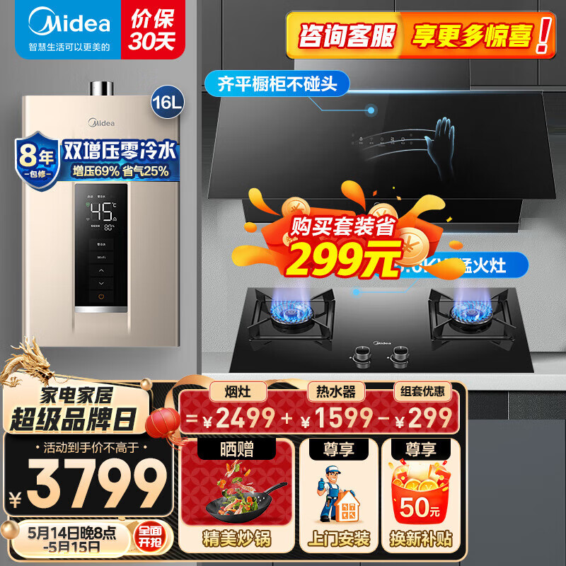 美的(Midea)侧吸抽油烟机灶具烟灶多件套装燃气热水器家用烟灶燃热厨房三件套J37+Q330+16NT1S天然气价格:3799.00元!