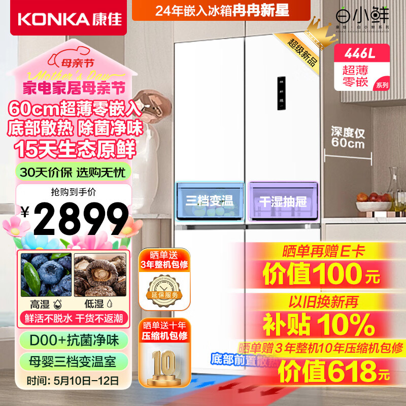 康佳446升60厘米零嵌超薄嵌入式底部散热一级能效双变频无霜十字对开四开门冰箱BCD-446WEGB4SP白小鲜价格:2799.00元!