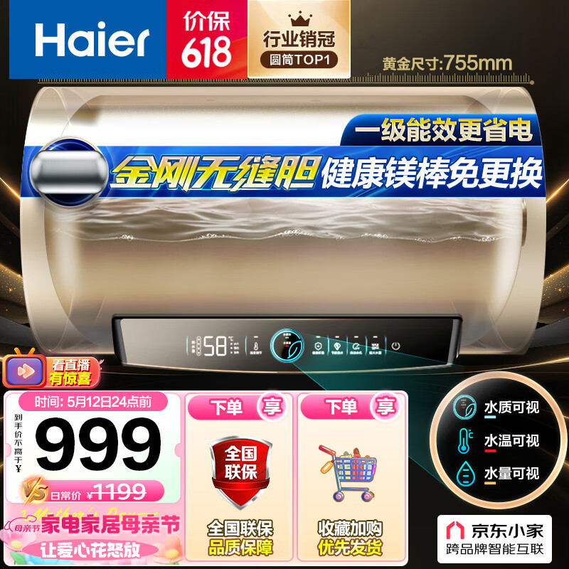 海尔(Haier)60升【金刚无缝胆】免换镁棒电热水器 家用储水式节能大水量水质监测WiFi一级能效 EC6001-PD3(U1)价格:1149.00元!