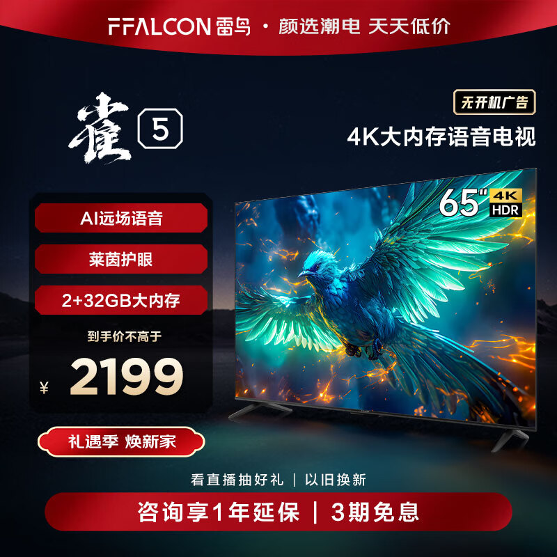 FFALCON雷鸟 雀5 65英寸电视 4K超高清 护眼防蓝光 超薄屏电视 2+32GB 游戏智能液晶电视机65F275C价格:2199.00元!