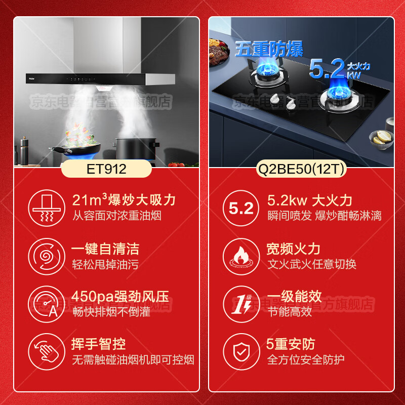 海尔(Haier)抽油烟机燃气灶套装 欧式顶吸自清洁挥手开关 21m3大吸力吸油烟机家用ET912烟灶套装5.2KW灶[家电]价格:2049.00元!