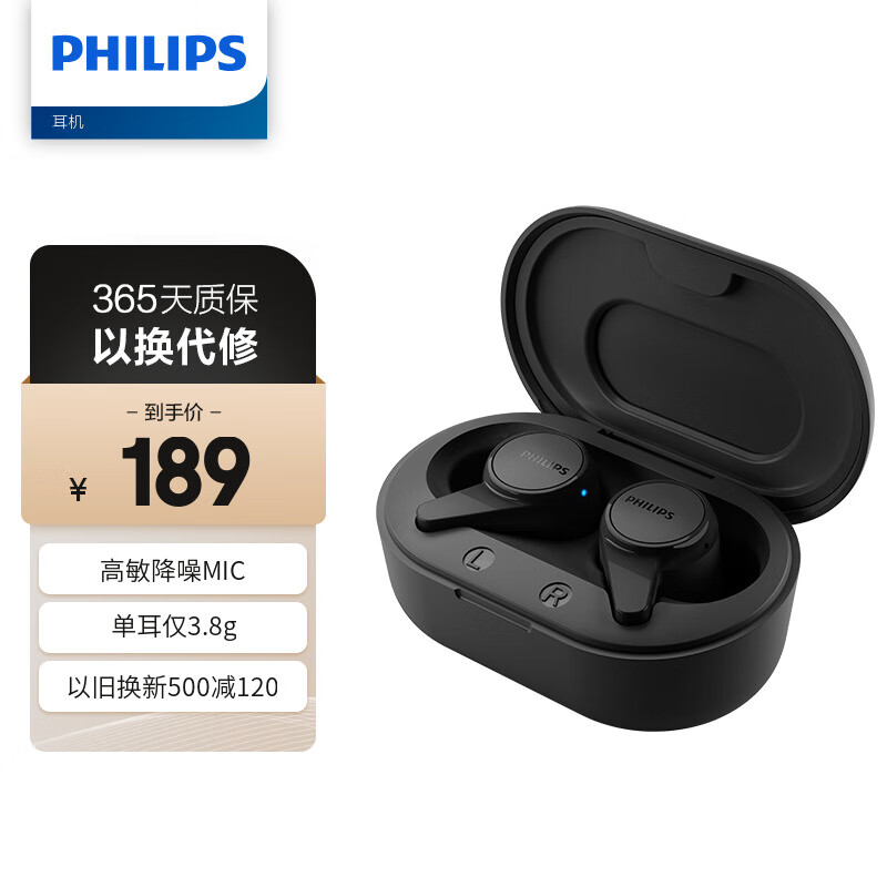 飞利浦(PHILIPS)真无线蓝牙耳机无线运动耳机游戏耳机回音降噪蓝牙5.2智能配对苹果华为手机TAT1207黑价格:189.00元!