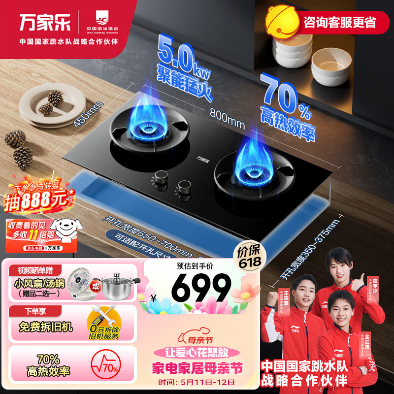 万家乐燃气灶 5.0kw大火力 70%热效率台式嵌入式两用燃气灶双灶 可适配开孔尺寸全进风天然气灶JZT-AY6价格:799.00元!