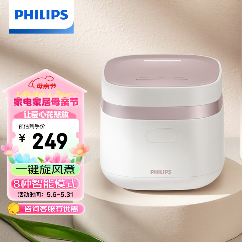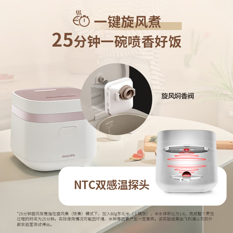 飞利浦(PHILIPS)多功能1.8L迷你电饭煲全隐藏式触控顶屏 24小时智能预约电饭锅HD3072/20白色(推荐1-2人)价格:249.00元!