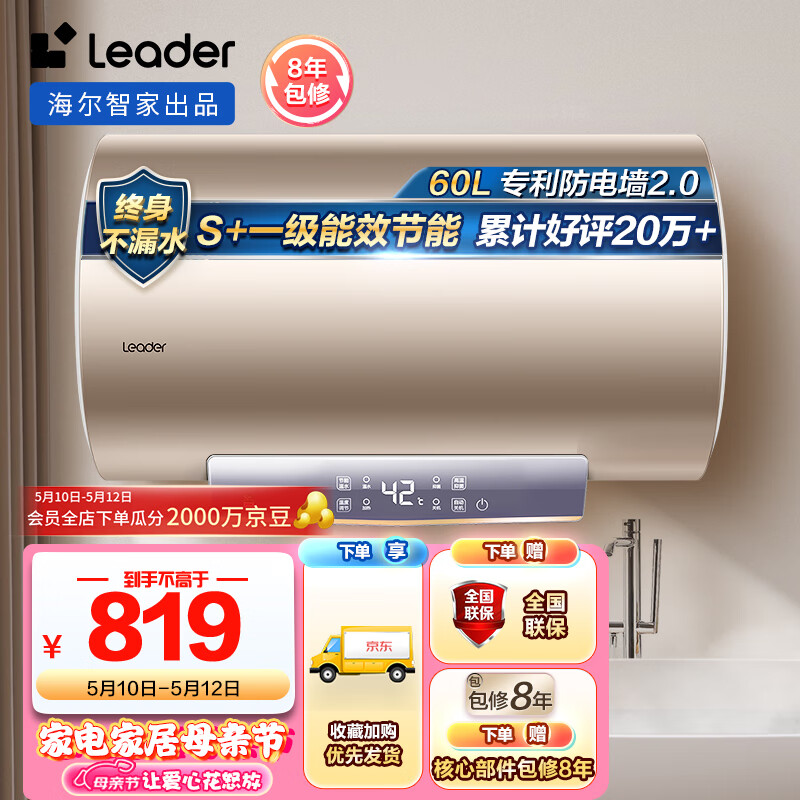 海尔智家出品Leader 60升电热水器家用储水式 速热大水量一级能效节能 LEC6001-LD5金【以旧换新】价格:1119.00元!