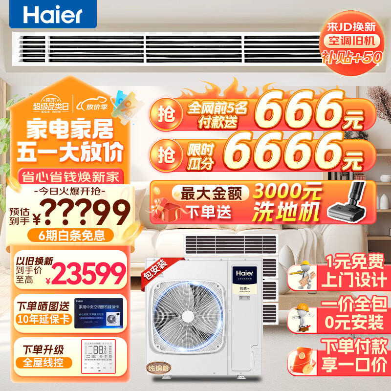海尔(Haier)中央空调一拖四风管机6匹小多联一级能效全直流变频嵌入式智尊+ RFC140MXSAVB(F)价格:24999.00元!