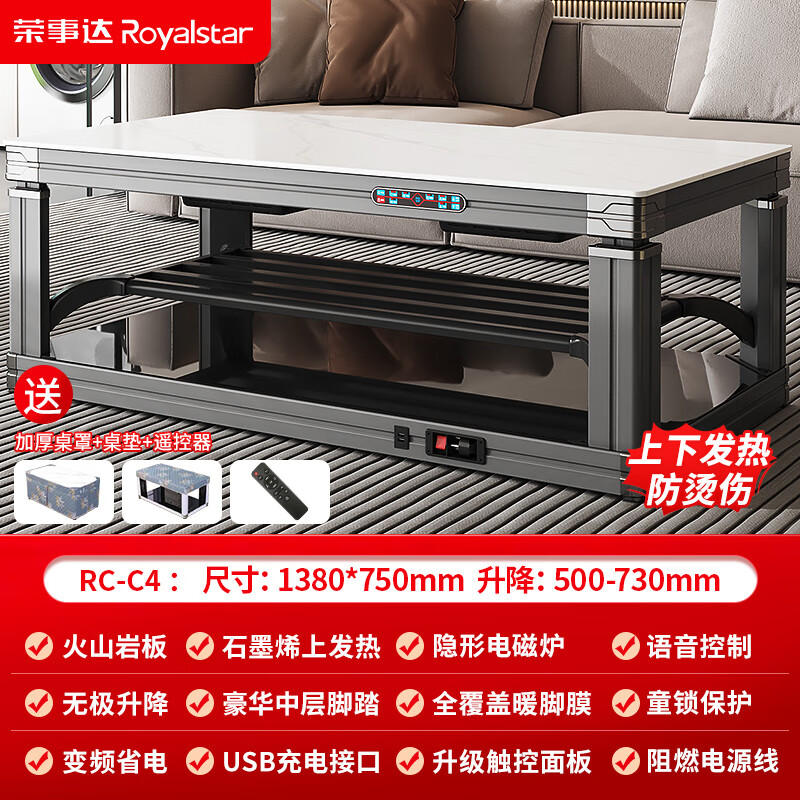 荣事达电暖桌1.38米取暖桌长方形烤火桌石墨烯发热烤火茶几家用变频节能多功能升降语音控制电暖炉RC-C4价格:1999.00元!