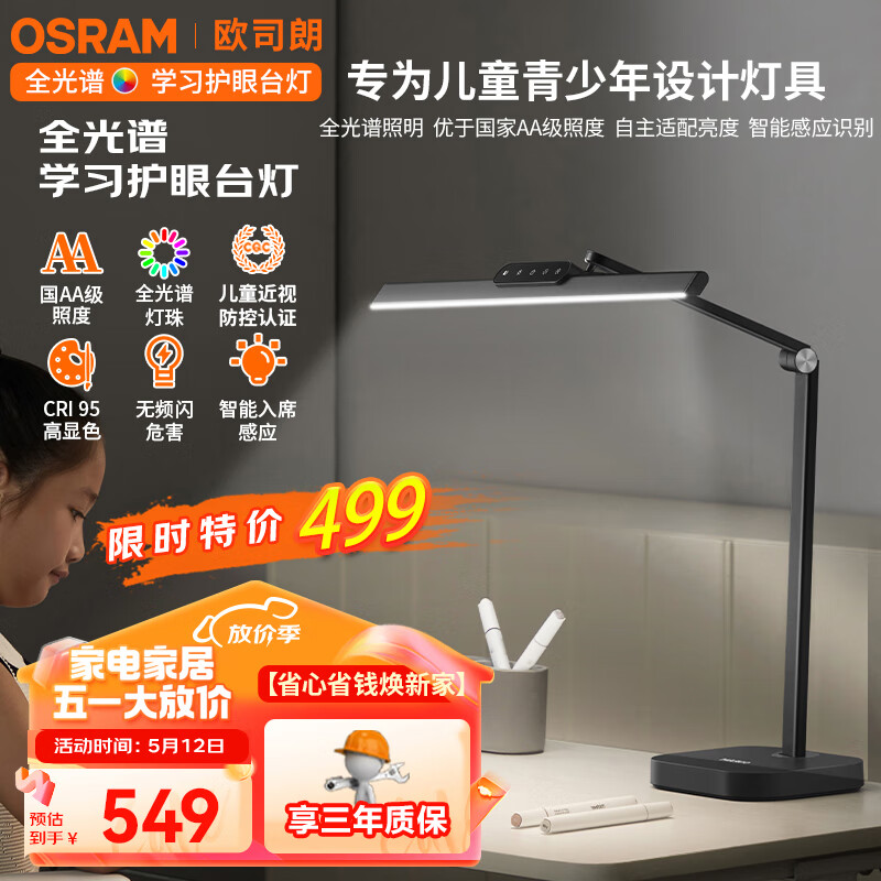 欧司朗(OSRAM)台灯护眼学习全光谱台灯学生学习专用阅读类太阳光儿童卧室床头灯价格:699.00元!