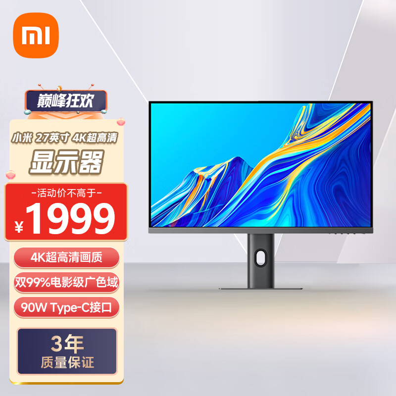 小米 27英寸显示器4K超清 IPS技术 99%sRGB HDR400 Type-C 90W反向充电 升降旋转支架 电脑办公显示器价格:1999.00元!