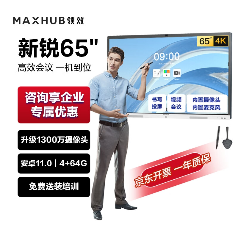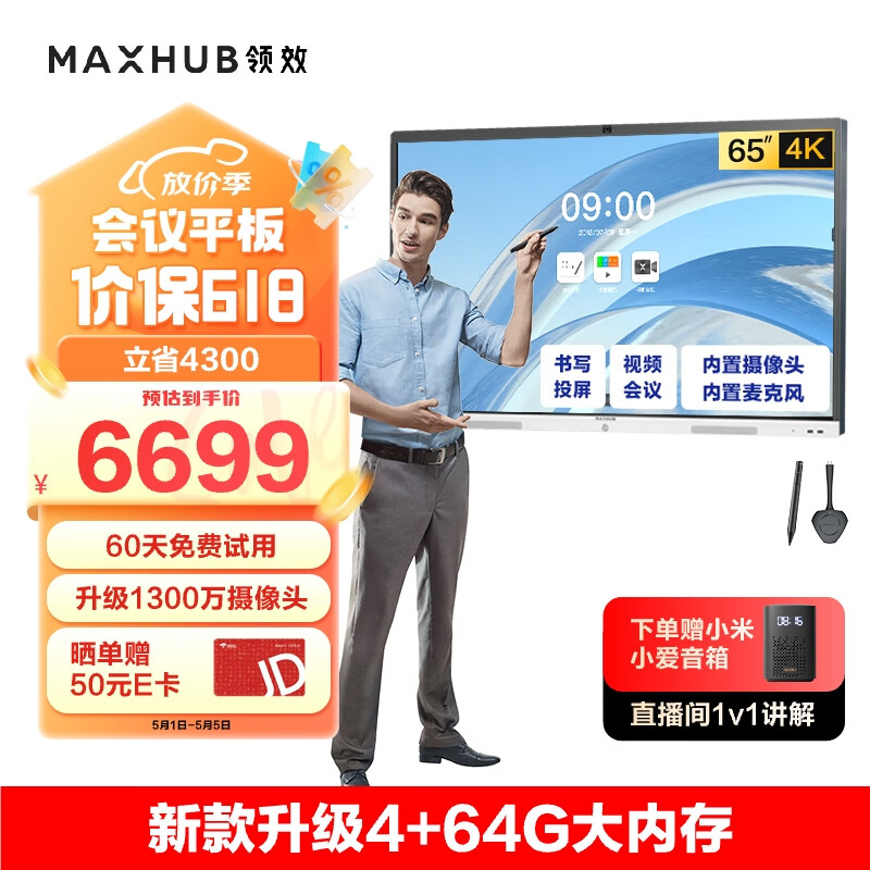 maxhub会议平板V6新锐65英寸触摸视频会议电视一体机 投屏电视智慧屏E65+传屏+笔 企采商用显示价格:6699.00元!