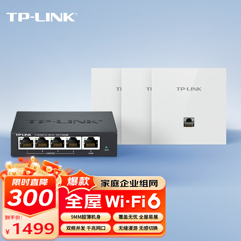 TP-linkAX3000全屋WiFi6薄款路由器无线面板AP套装家用企业mesh组网易展版双频千兆5口AC路由器*1+3AP白色价格:1699.00元!
